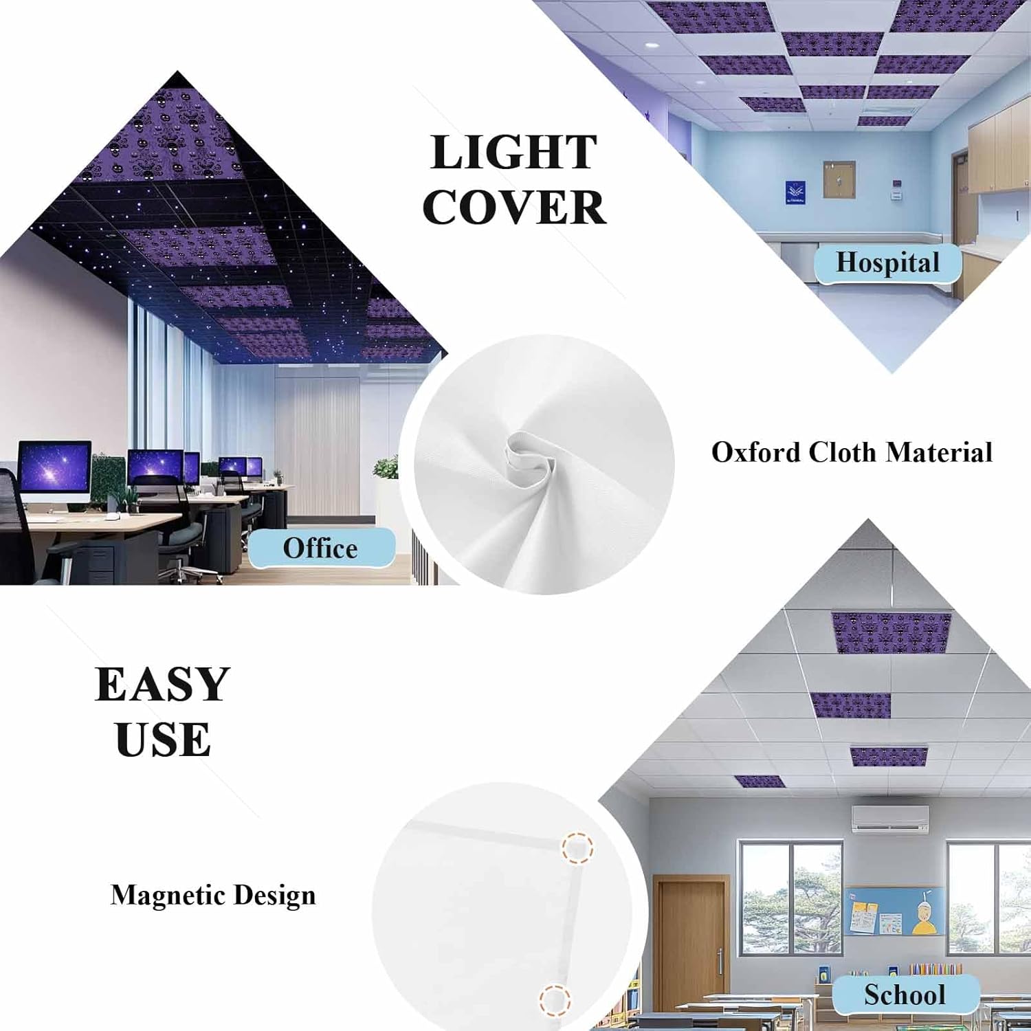 Halloween Fluorescent Light Covers to Enlighten Your Living Space & Make Your Space InspiringProduct DescriptionMaterial: oxford fabric with magnetsSize: 4 x 2 feet (122x61cm)Package:Pack of 1/2/3/43 Easy Steps to Install1. Select and unfold a magnet light cover2. Using a step-ladder climb to the desired light3. Attach the sewn-in magnets on the outside of the ceiling grid, covering the light.Exquisite WorkmanshipThe fluorescent lamp shade is made of high-quality Oxford cloth, which is reusable and very environmentally friendly. The pattern printing is clear and the visual effect is good.Easy CleanWaterproof fabrics, wipe them by wet rag. Or just machine wash in cold water, avoid bleaching. This ensures that you can enjoy using our light cover without having to worry about a complicated cleaning process.Create a Peace EnvironmentThe fluorescent ceiling light cover for ceiling lights can effectively weaken the light, alleviate the temporary dizziness caused by lighting, which can reduce the eyes' discomfort, creating a peace and ease environment.Versatile Ceiling LightsFrom classrooms to medical facilities, our ceiling light replacement cover shines in various settings. Whether you're in a school, hospital, or dentist's office, these fluorescent light covers promote a better working environment. The exquisite design adds more beauty to your ceiling. Vibrant HD PatternOur magnetic light filters come in a variety of vibrant colors and patterns for each season and occasion. Give your space a real personality, the perfect gift for daily and various holidays.