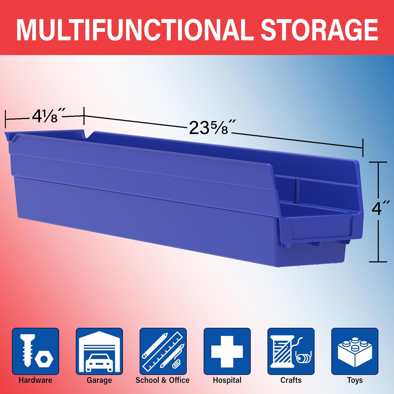Stay organized with Akro-Mils Shelf Bins, the versatile, durable solution for every space. Made from industrial-grade polymers, these heavy-duty storage containers are a long-lasting alternative to weak cardboard options. Waterproof, easy-to-clean, and built to withstand indoor and outdoor use, they’re perfect for garages, kitchens, offices, closets, under sinks, or in cabinets. Designed for spill-free retrieval, their unique lip allows effortless tilting forward for easy access to tools, supplies, or household items. Customize your storage with optional dividers, bin cups, and label holders (sold separately) and choose from a variety of colors for an organized and efficient system. Great for a wide range of uses, including, bathroom cabinet storage, kitchen organization, office organization, closet organization, tool storage, and office storage. With a curved-bottom hopper front and space-saving nesting, these bins fit 12", 18", or 24" deep shelves and vertical storage units. Note: these shelf bins are NOT stackable. Proudly made in the USA, Akro-Mils Shelf Bins combine strength, convenience, and adaptability for all your organization needs.