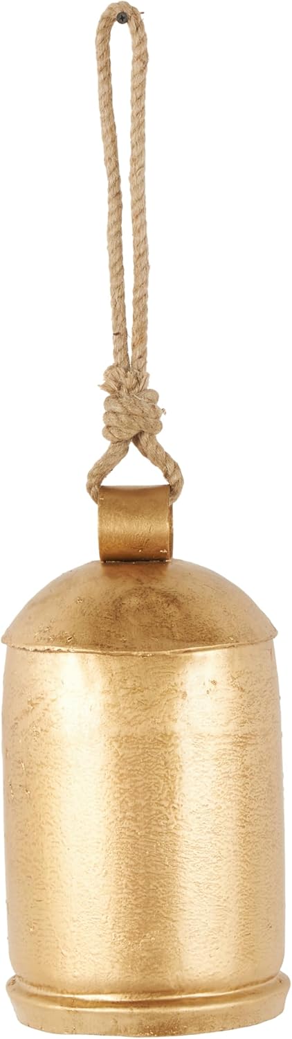 Rustic decorative bell for home decor is constructed with robust iron-welded body complemented by a carefully braided jute rope for an added touch of artisanal elegance. Satin gold decorative bell for holidays has a classic bell shape and a jute rope forming a loop at the top, that complement various decor styles with its timeless design. Wipe clean with a dry cloth. Perfect for enhancing the ambiance of living rooms or kitchens, this gold meditation bell brings both style and function to your home. This item ships in 1 carton. Can be hung vertically using the cotton cord; nails and screws not included. Suitable for indoor use only. This item ships fully assembled in one piece. Made in India. This is a single gold colored meditation bell. Rustic style.