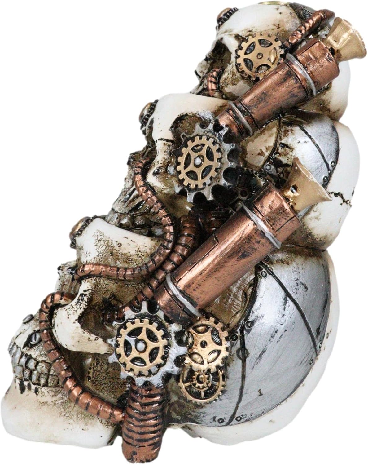 This is a unique incense burner in that not only is the design concept steampunk gothic fantasy, it has a cool 'smoking' effect out of the eye sockets and around the sculpture when you light a backflow incense cone. Fog can be seen exiting from the skulls giving the statue a wicked and bizarre look.