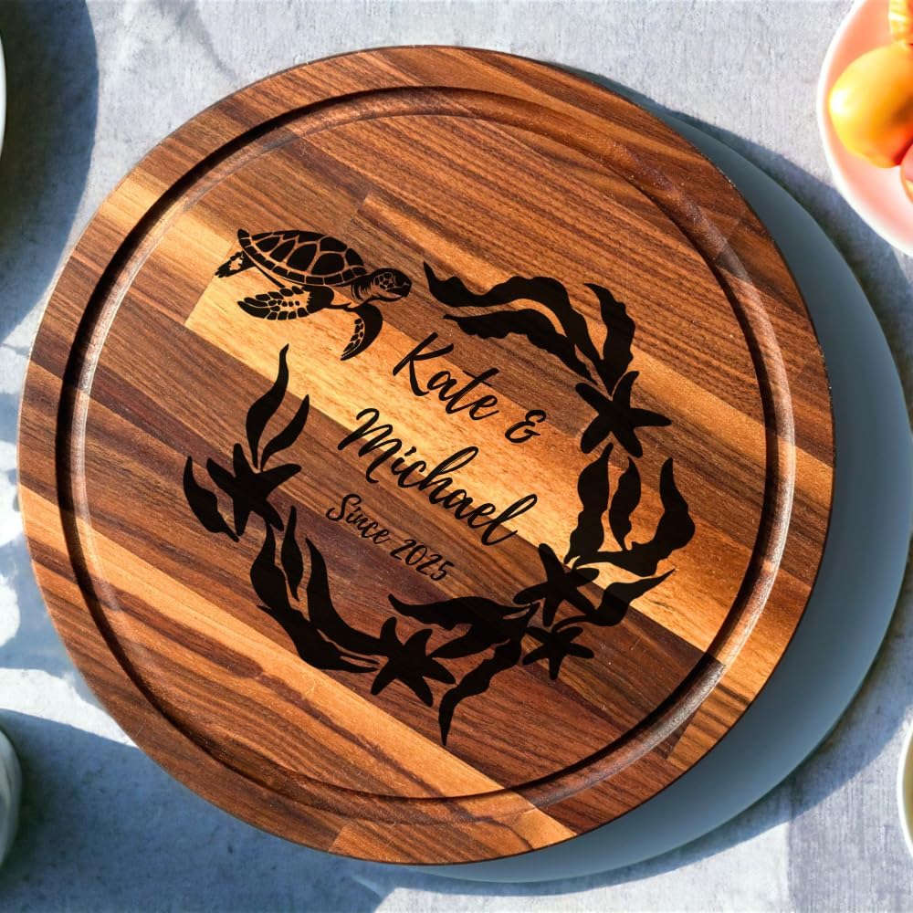 This sea turtle themed cutting board is made of walnut wood. Black walnut wood is a hardwood that’s environment resistant and appropriate for indoor and outdoor use especially as a cutting board. The wood has a straight grain, which can sometimes be irregular. It has a slightly coarse texture, and a deep natural shine when worked. All our wood products are food safe and natural. We definitely do not use varnish or any other toxic materials. We only use olive or sunflower oil to our products. Not Just for a cutting board. Performs well as a cheese board and charcuterie board. Use this walnut cutting board as a home and kitchen decor. Great as a sea turtle lovers gifts! Gifting it at valentines day, wedding, engagement, housewarming, mother’s day, and Christmas. Our cutting boards are available 5 styles: Rectangle, rectangle with juice groove, arched with juice groove, board with handle (only 1 size available as a large) Round pizza board Available dimensions: Medium: 12” x 8” x 0.8” (long x width x thick) Large: 16” x 11.5” x 0.8” (long x width x thick) 11.5" Round 15.5" Round HOW TO ORDER -Select your board type, size and design option. - Then, in personalization box, indicate where your design will be on cutting board. If you want to ask, change or request on your order, we are here to help !!