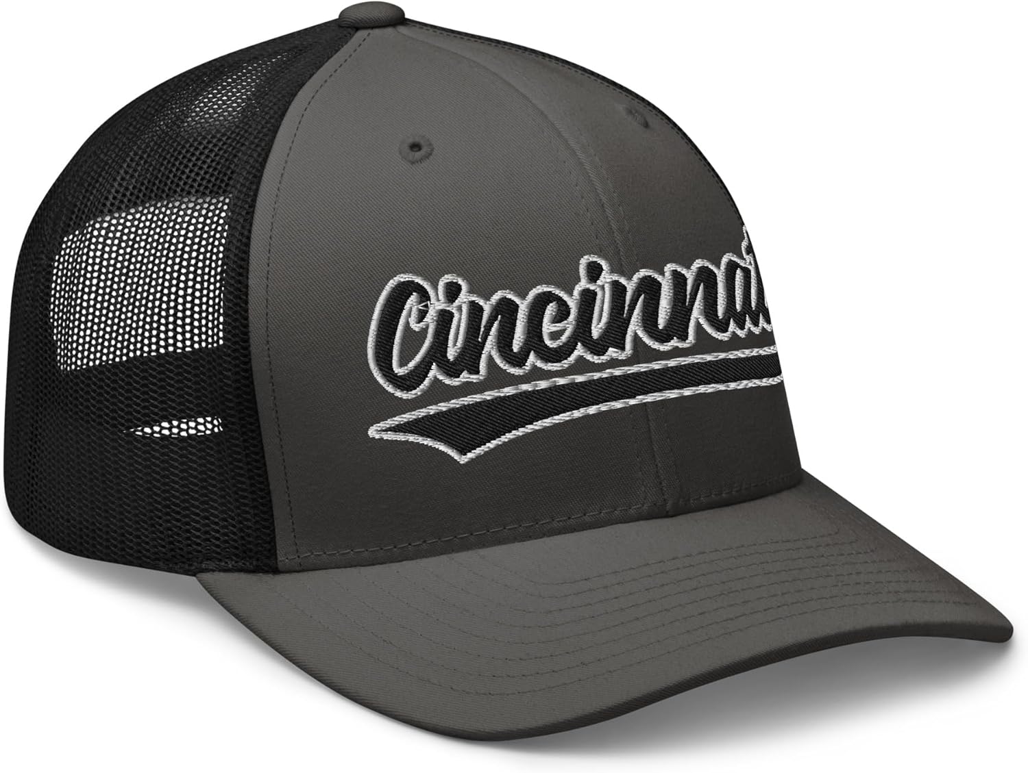 A stylish, mid-profile trucker cap that was created for people who love Cincinnati, this retro Cincinnati trucker hat is is sure to be appreciated by fans of Cincinnati sports and anyone who is from Cincinnati, OH. Features an embroidered retro Cincinnati baseball script with swoosh. An awesome gift or souvenir, this mesh Cincinnati trucker cap is an excellent choice for lovers of Cinci. Mid-profile, structured 6-panel Cincinnati hat60% cotton, 40% polyesterHard buckram front panels w/ mesh backPermacurv visor, matching undervisorPlastic snap closureHead circumference: 21 ⅝” – 23 ⅝”Type: Cincinnati trucker hat, mesh trucker capEmbroidered in the USACincinnati GoTime Apparel